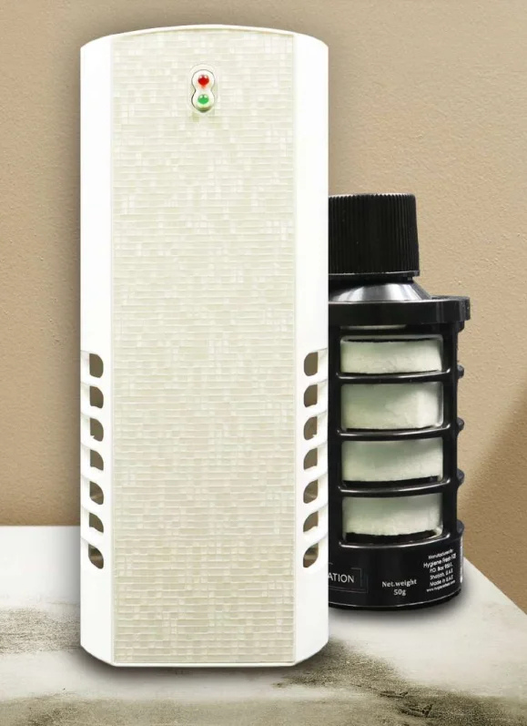 Standalone, wall-mounted, and AC duct systems with aerosol and eco-friendly oil-based fragrances from Rubbermaid and Dr. Scent.